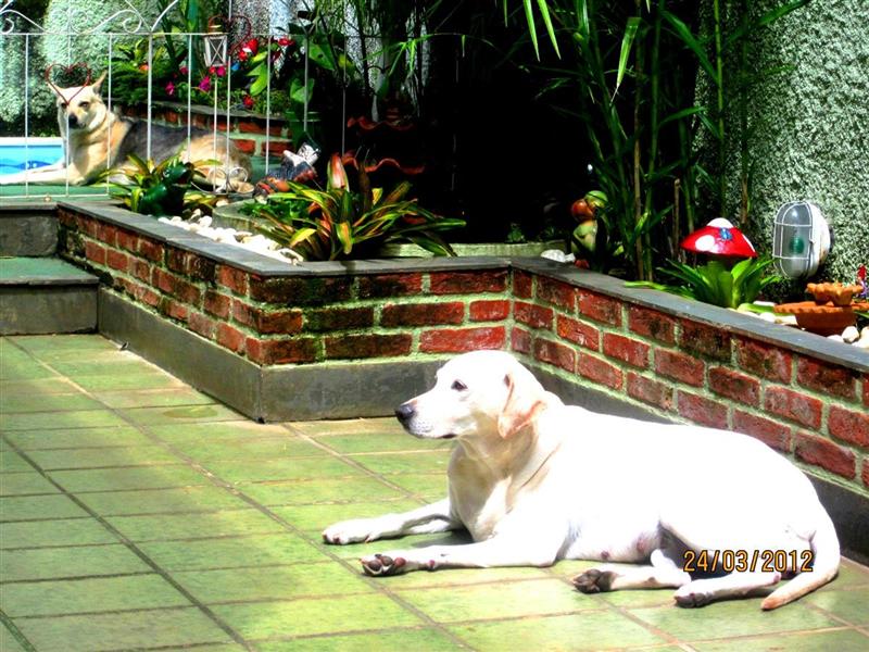 Achter onze flat op de eerste verdieping hebben ook wij een open ruimte van een 45 vierkante meter, die wij onze eigen private ruimte kunnen noemen, door hoge muren afgesloten van de omgeving.