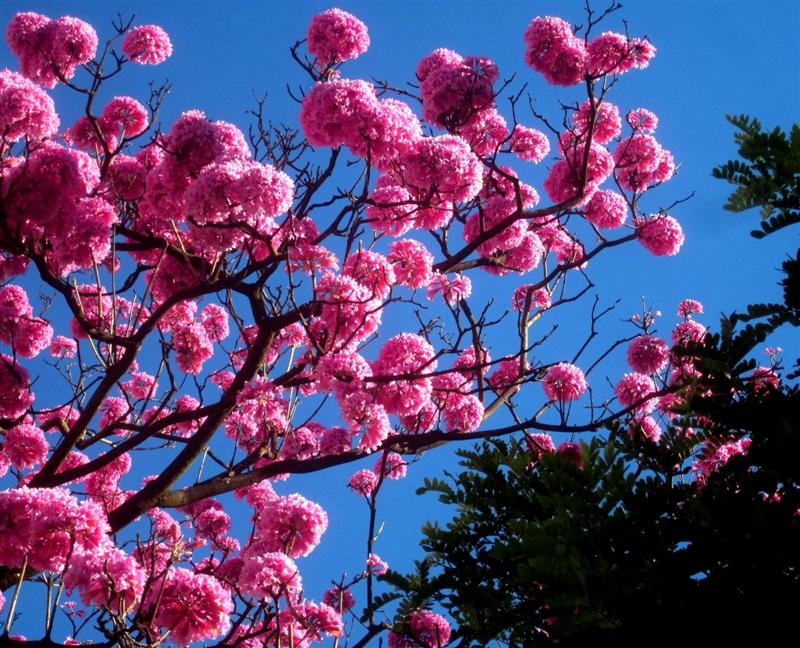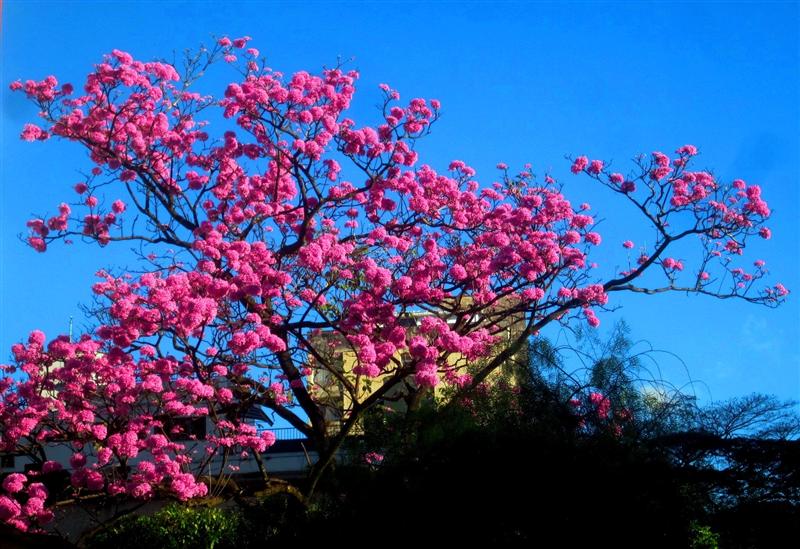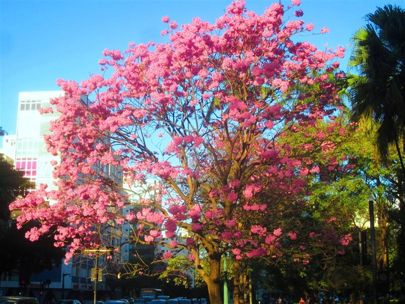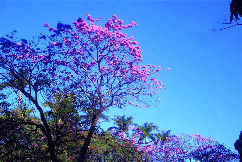 Hier in de stad zijn het vooral de roze ipê’s die te kust en te keur op straathoeken en pleinen hun schoonheid laten zien.