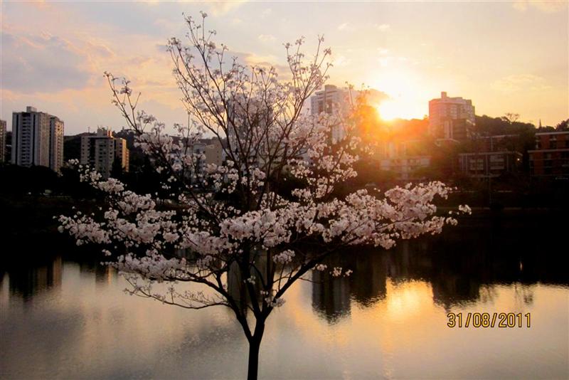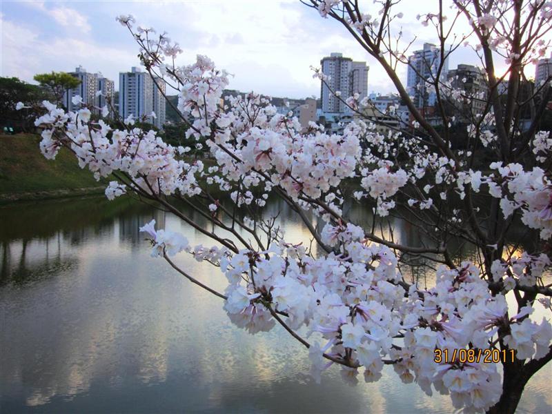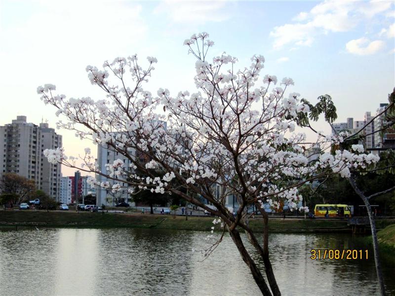 De witte ipê zien we hier vlak bij onze flat, tijdens onze rondjes rond het meer. In augustus bloeit zij maar heel even en na twee dagen vindt zij het genoeg en maakt zij een tapijtje van witte bloemen op het gras eronder. Dan pas komt de tijd dat de bladeren weer verschijnen.