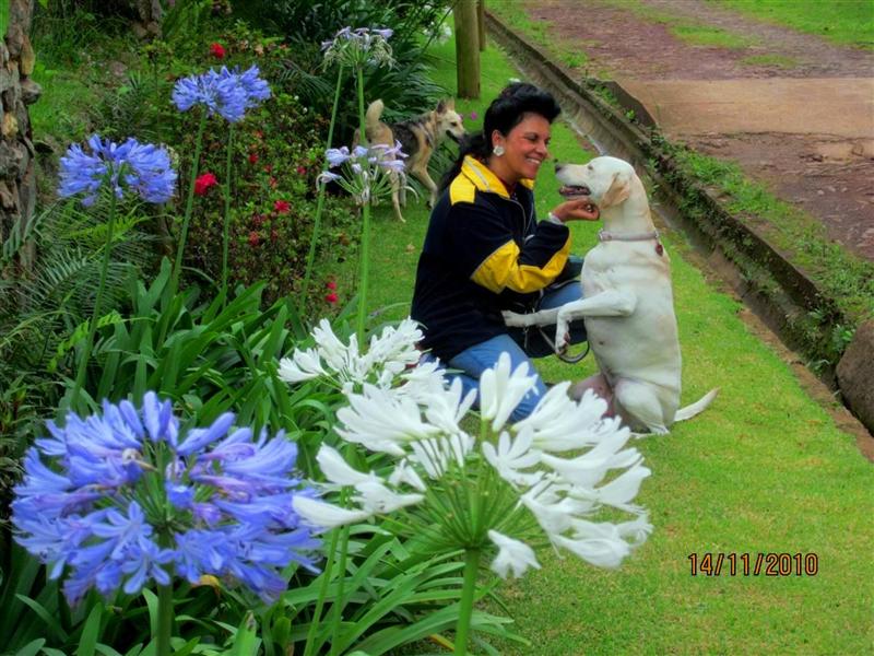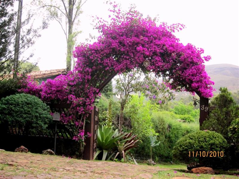 Vanaf de veranda, de gele ‘fedegoso’ en de paarse ‘quaresmeiras’ (vastenbloemen), die in de vasten (quaresma) bloeien.