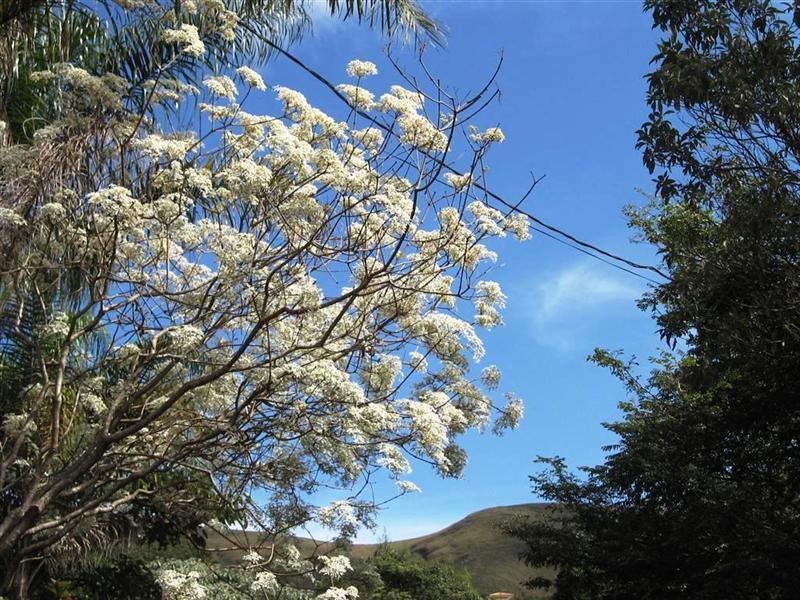 De aratingaboom (de nectar van deze bloemen is het lievelingseten van de aratinga) naast ons Hemeltje.