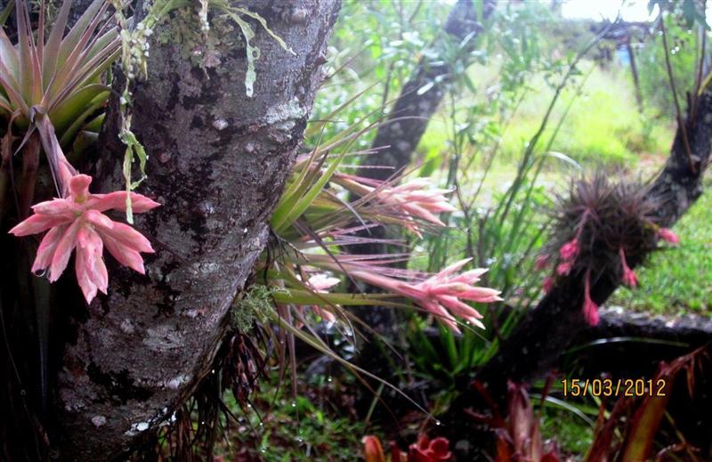 Kleine bromelia’s vast geklit aan oude boompjes in onze tuin.