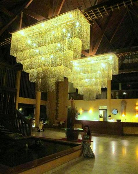 De versieringen aan de verlichting zijn gemaakt van plaatselijke producten uit de zee, zoals schelpen en stukjes koraal, de decoratieobjecten van het daar veel voorkomende, dus goedkope, bamboe en resten van scheepjes en visserij. Veel natuurlijk en aangeplant groen rondom, met hibiscusbloemen uit eigen tuin.