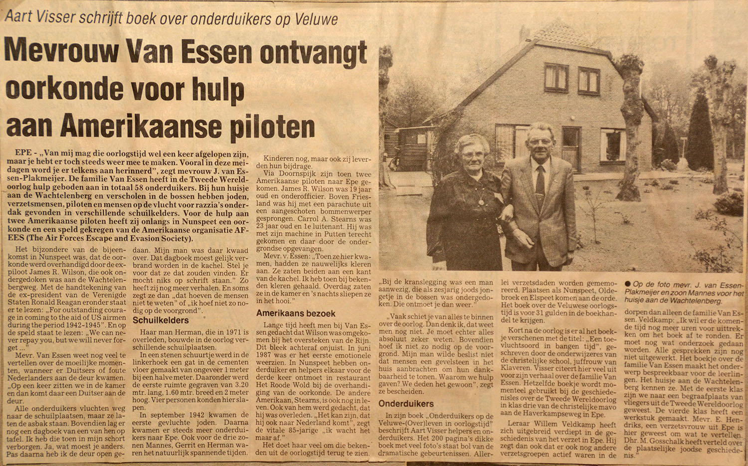 Mevrouw Van Essen met de geallieerde piloot J.P.Wilson, over wie in het artikel uit het tienmalige Noord Veluws Dagblad hieronder meer is te lezen.