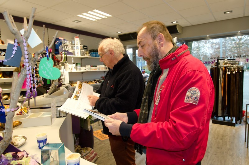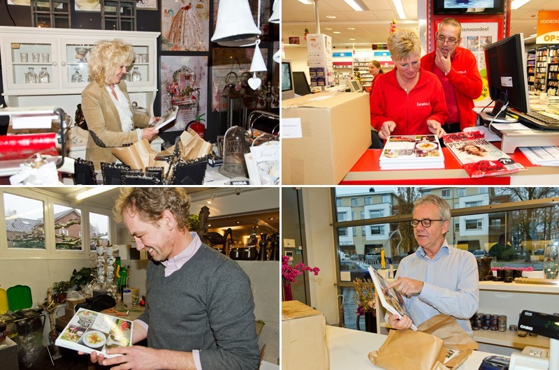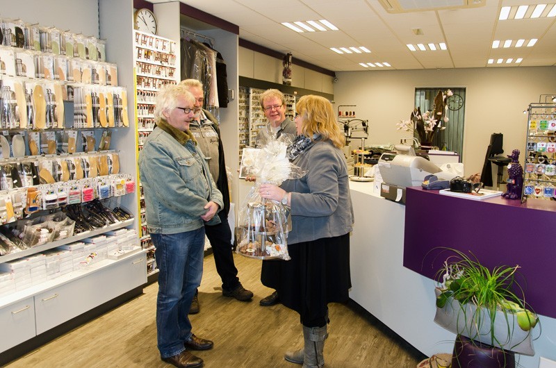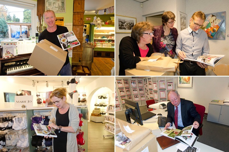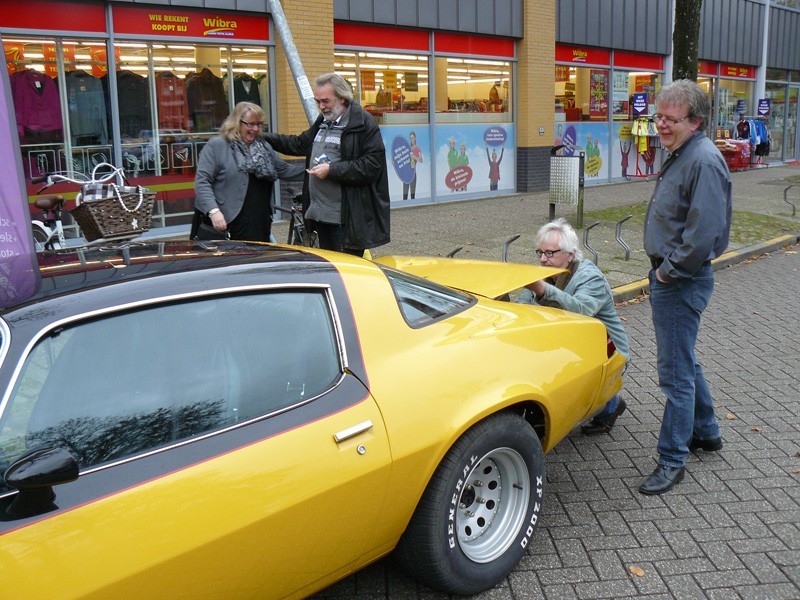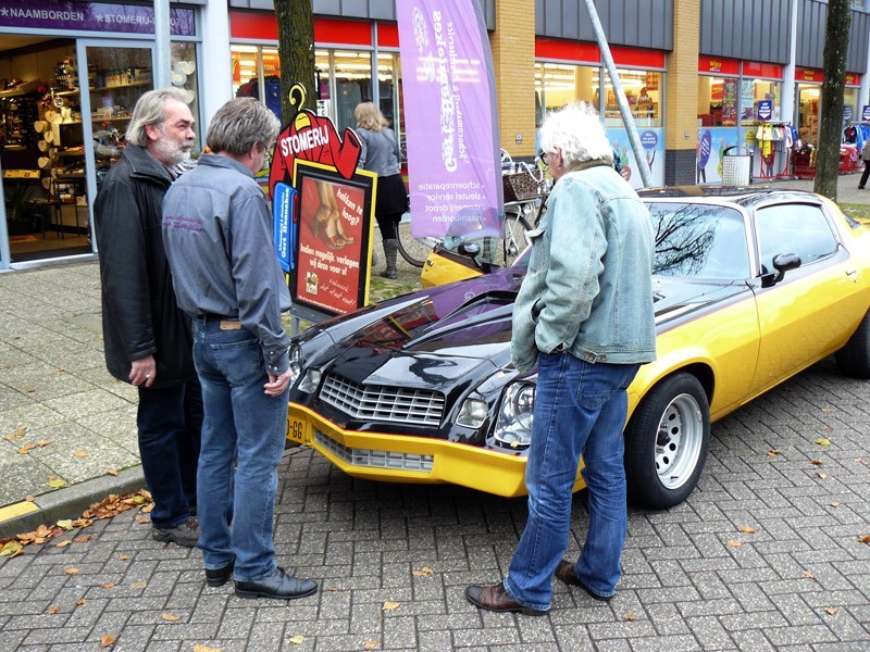 In eerste instantie was het niet de bedoeling om zelf alle boeken af te leveren, maar daar kwamen we op terug, want wat is het nu mooier om al deze mensen die op een fantastische manier hebben meegewerkt aan het boek, ook persoonlijk de boeken te overhandigen. Gert en Anita Hennekes hadden ons al eens gevraagd wie de boeken zou komen brengen en tevens gaven ze aan dat ze het op prijs zouden stellen als wij dat persoonlijk zouden doen. Dat wilden wij wel en we hoefden er niet lang over na te denken op welke wijze dat te doen. Allebei zijn ze bezeten van auto's, ze bezitten zelf ook een paar fraaie, waaronder een oldtimer, die ook in het boek staat. Nu kennen we iemand die in het bezit is van een Chevrolet Camaro uit de jaren 70 en met die auto gingen we voorzien van boeken richting Schoenmakerij Gert Hennekes, waar ze er niet van op de hoogte waren dat wij op die manier de boeken kwamen bezorgen. U begrijpt de blikken van autoliefhebbers Gert en Anita wel. Hierbij waren ook Gert van den Esschert en Jan van de Vlekkert aanwezig, die allebei ook hebben meegewerkt aan het boek. Op onze beurt wisten wij weer niet dat we een presentje overhandigd zouden krijgen in de vorm van een etagère met lekkernijen. Gert en Anita, het was top! Dit was al een zeer prachtig en onvergetelijk moment van de lange dag die er op volgde.