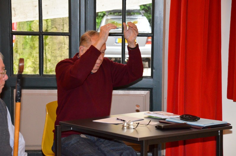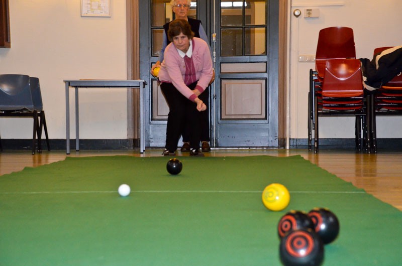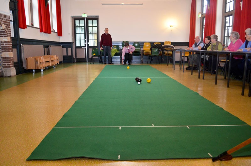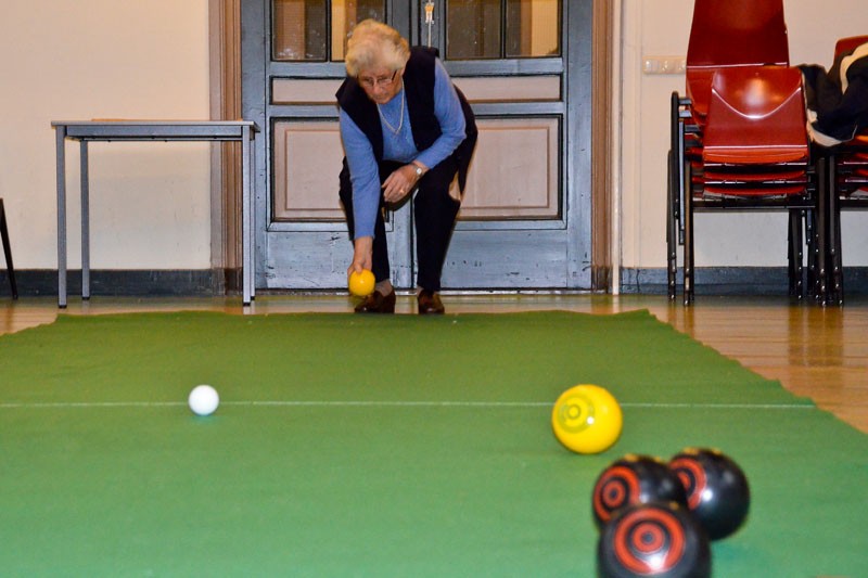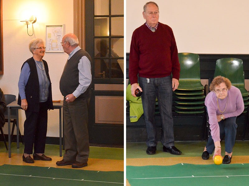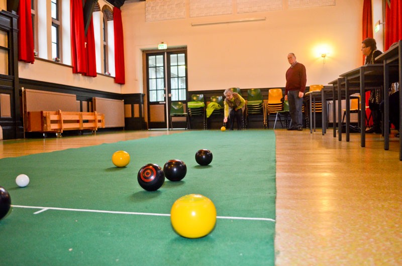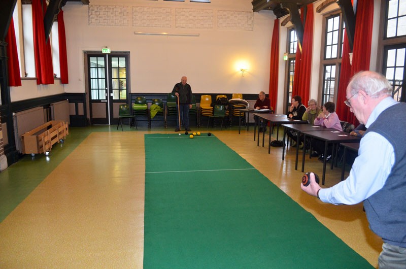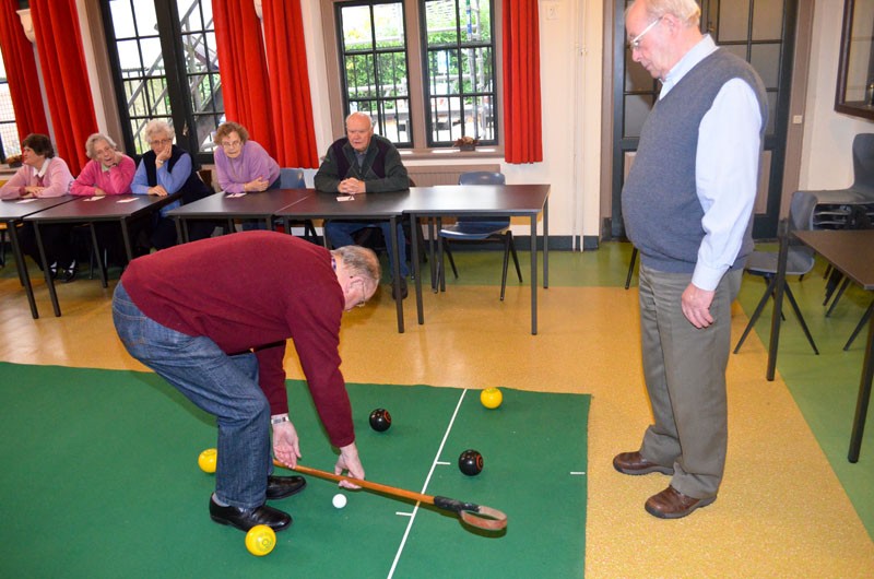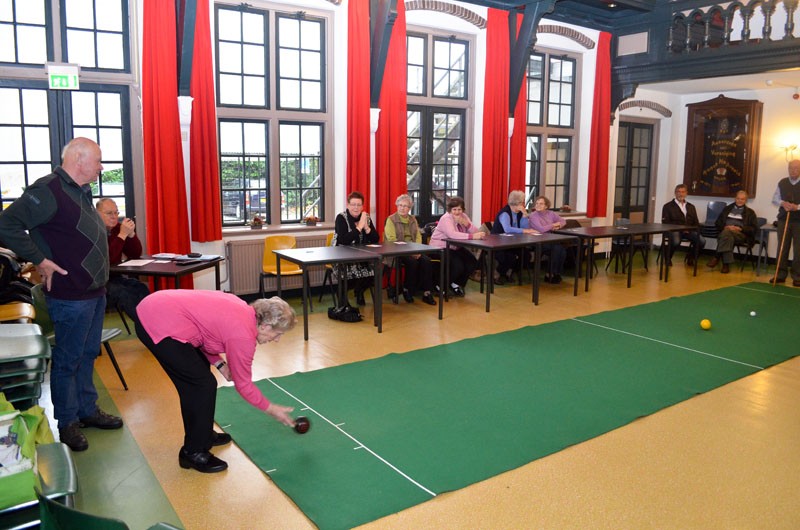 Het gaat er heel gemoedelijk aan toe deze middag. Met negen deelnemers is iedereen gemiddeld zo eens per kwartier aan de beurt en de rest van de tijd volgen ze het spel zeer geïnteresseerd. Als twee spelers in actie moeten komen die evenveel punten hebben, wordt door een muntje op te gooien beslist wie de jack mag gooien en met het spel mag beginnen. Maar daar doet niemand moeilijk over, want als meedoen ergens véél belangrijker is dan winnen, is het hier wel. Ze zijn net zo blij met een goede beurt van een ander als wanneer ze zelf goed gemikt en de bal je juiste snelheid gegeven hebben.