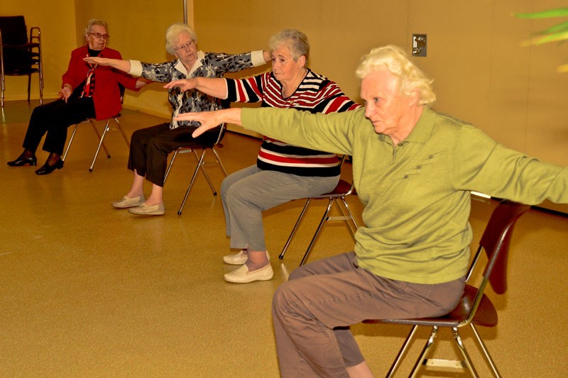 Na een paar rondjes stevig doorstappen neemt iedereen plaats op een stoel, waarop de meeste oefeningen worden gedaan. Ze zijn allemaal gericht op het flexibel houden van de nekspieren, de schouders, ellebogen, handen, vingers, heupen, knieën en enkels. Draaien, strekken, buigen, zwaaien en zwieren; deels op muziek die de meeste deelneemsters graag horen en sommigen zachtjes meezingen.