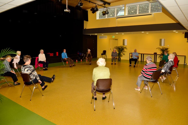 De dames doen oefeningen onder leiding van Leontien Mensink, die dit werk al zestien jaar doet. Ze moet helaas vaststellen dat de belangstelling in die periode is afgenomen. Jaren geleden had ze drie groepen van een kleine twintig mensen, nu nog maar twee van ongeveer twaalf dames. Inderdaad, alleen dames. Waarom heren verstek laten gaan, is niet bekend. De oefeningen zijn nuttig voor iedere senior die de gewrichten soepel wil houden.