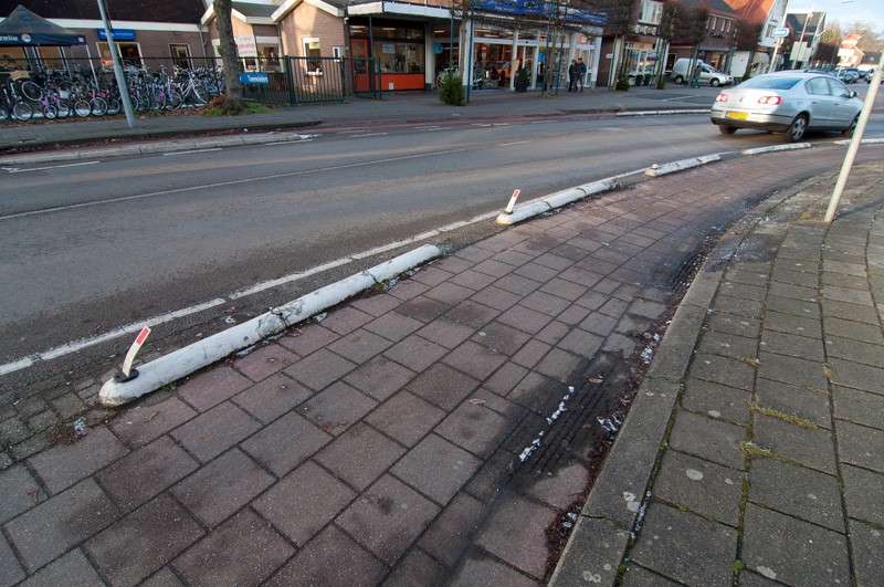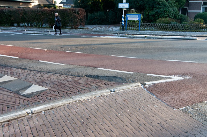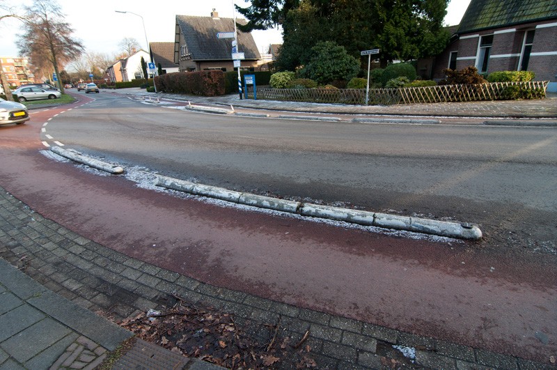 Deze flexibele paaltjes verdwijnen echter als sneeuw voor de zon. Ieder weldenkend mens had van te voren wel kunnen nagaan dat deze paaltjes speelgoed zijn voor sommige weggebruikers. Het is toch heerlijk om al fietsende tegen deze paaltjes te schoppen, maar automobilisten vergissen zich ook nog wel eens in een wegsituatie. De winter is al bezig en er kan nog genoeg sneeuw vallen, zodat de varkensruggen helemaal niet meer in het zicht liggen. Onlangs zag ik dat een auto komende vanaf de Hoofdstraat, rechtsaf slaand, de varkensruggen ook niet zag en met twee wielen dus het fietspad nam. Van de geplaatste flexibele paaltjes zijn er nu nog maar weinig over, ik houd dus mijn hart vast als er sneeuw valt, want die varkensruggen zijn ook bijna sneeuwwit van tint. Volgend jaar zal volgens de berichten van de gemeente deze kruising worden aangepast, maar ja, in Epe duurt alles wat langer.