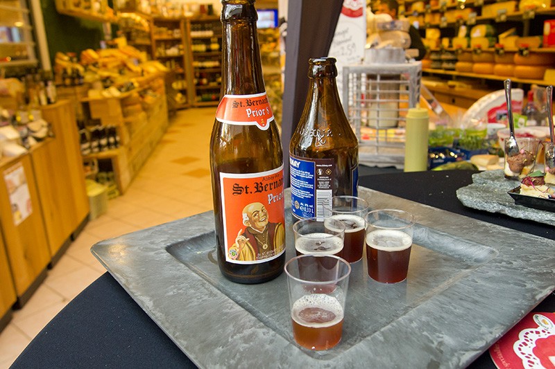 Leg hierop een stukje Chimay a la Blue kaas en vervolgens met een spuitzak een bolletje zelfgemaakte chocolademousse van Belgische chocolade (mag ook andere).