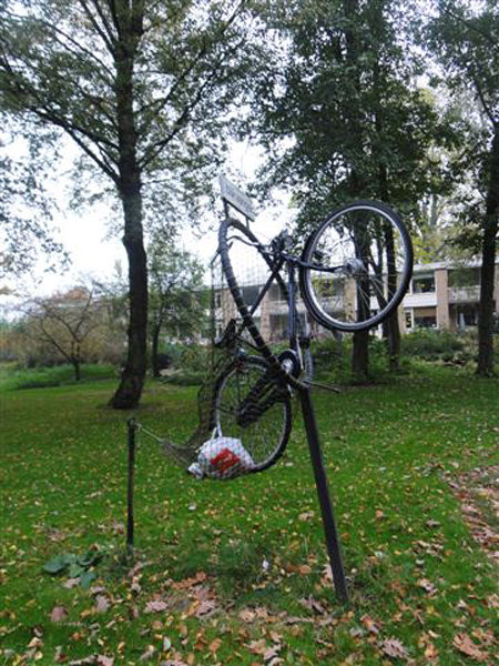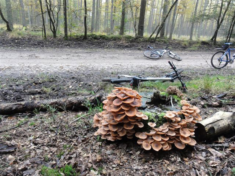 ,,Na het Koefeest toch maar even verder gefietst naar de Rauwenhoffweg en daarna naar Anna's Hoeve. Iets voor de Hoeve staat een dode boom, mooi om te zien. Daarna het pad in gefietst. Zaterdagmorgen ben ik met mijn kleinzoon daar ook geweest, maar daarvoor ben ik even langs Bert H. gegaan, maar die liep nog in zijn huisdress, dus die kon niet mee. Mijn kleinzoon heeft erg genoten met zijn opa in dat bos. Zondag ging ik met mijn fietsmaat en schoonzoon op pad. Het eerst dat we zagen, was dat Epe een nieuwe fietsenstalling heeft..... Toen maar doorgegaan richting Wellna. Daar zagen we de mooiste vliegenzwam, zo diep van kleur, een plaatje!. Daarna verder, twee maal bijna verdwaald, maar we zijn weer thuis gekomen. De witte statige zwam heet geschubde inktzwam".