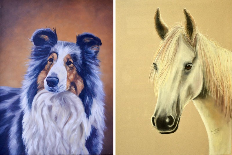 Op tafel ligt een map met foto’s. Er zitten foto’s van hondenkoppen in en foto’s van hondenkoppen die met pastelkrijt zijn getekend. Op sommige pagina’s lijken twee exact dezelfde foto’s te zitten. Je moet heel goed kijken om het verschil te zien. Twijfel slaat regelmatig toe. Is het nou een foto of een foto van een tekening/schildering? Idem dito met foto’s van paarden, katten, vogels en wild.