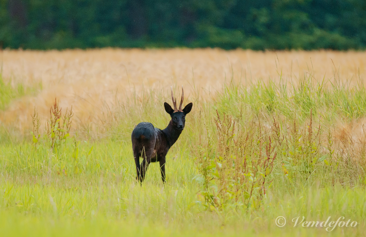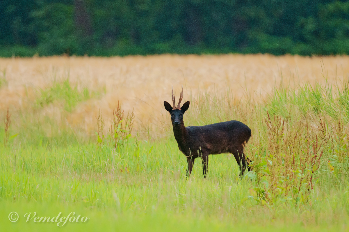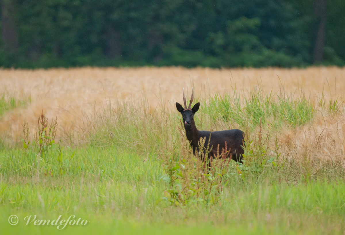 Vrijdagavond zijn mijn maat Wim Bosch en ik op pad geweest om een zwarte reebok op de plaat te zetten. Ik had deze bok vorig jaar gezien, maar niet kunnen vastleggen. Het is een bok van ongeveer 6 jaar en een prachtig exemplaar. We hebben de fototentjes opgezet en goed gecamoufleerd zodat we uit alle hoeken konden schieten met onze camera’s. Eerst kwamen er een paar geiten en later nog een jonge bok, maar daar kwamen we niet voor; die zwarte wilden we, maar die kwam maar niet. We hadden net met elkaar overlegd dat we weg zouden gaan, toen opeens de zwarte bok tevoorschijn kwam. Wat een mooi dier!